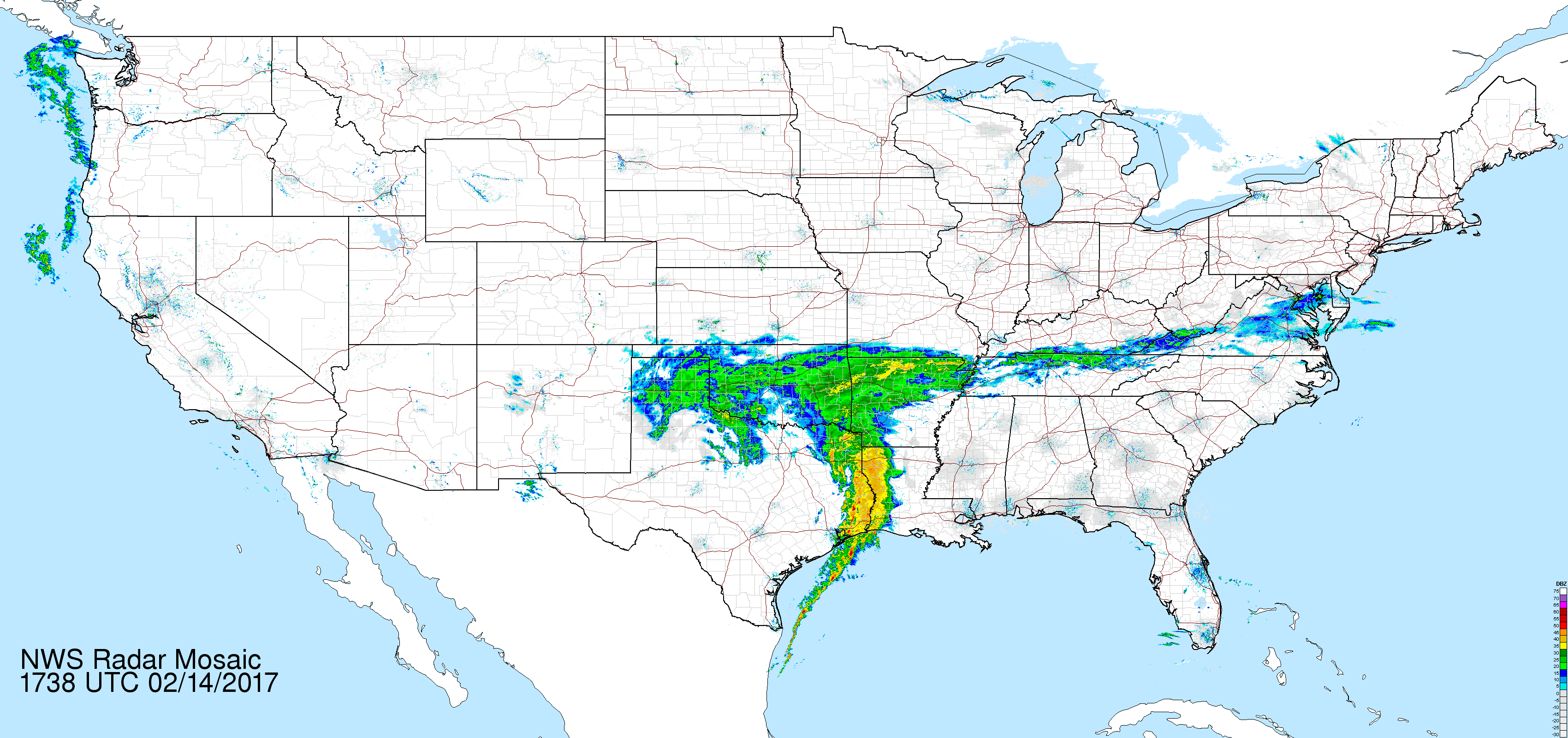 The Composite Radar Images are captured from the National Weather Service every 10 minutes. Please Note that the animations are very large (about 60MB for a full day) and will take a while to download entirely. Once the animitaion is downloaded entirely it will change frames about every half second, the interval between frames is aprox. 10 minutes actual time.